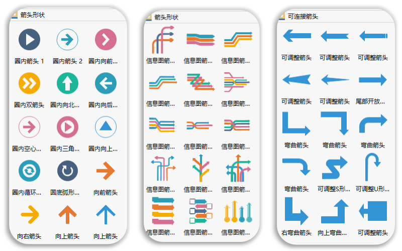 亿图软件是结合了PPT、Word、Excel、Photoshop等多种办公软件优点于一身的综合型图表设计软件。箭头图内置单向箭头、燕尾箭头、双重指向的双向箭头,专门放在结尾的尾部箭头,弯曲箭头等。另外还有可调整箭头,方便根据页面排版改变箭头形状线条比例。箭头形状和列表类型板块是亿图图示为用户根据不同场景需求提供的,例如圈内箭头,降级箭头,3D 箭头,信息图箭头等各式各样的箭头图标。