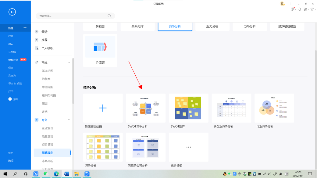 在“新建”页面依次选择“新建>商务>战略策划>竞争分析”;