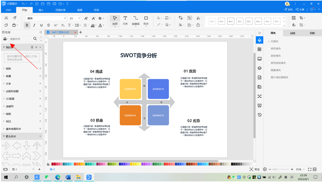 这里我们可以点击符号库下方的符号,选择添加SWOT竞争分析图的相关符号。这里已有基础符号。