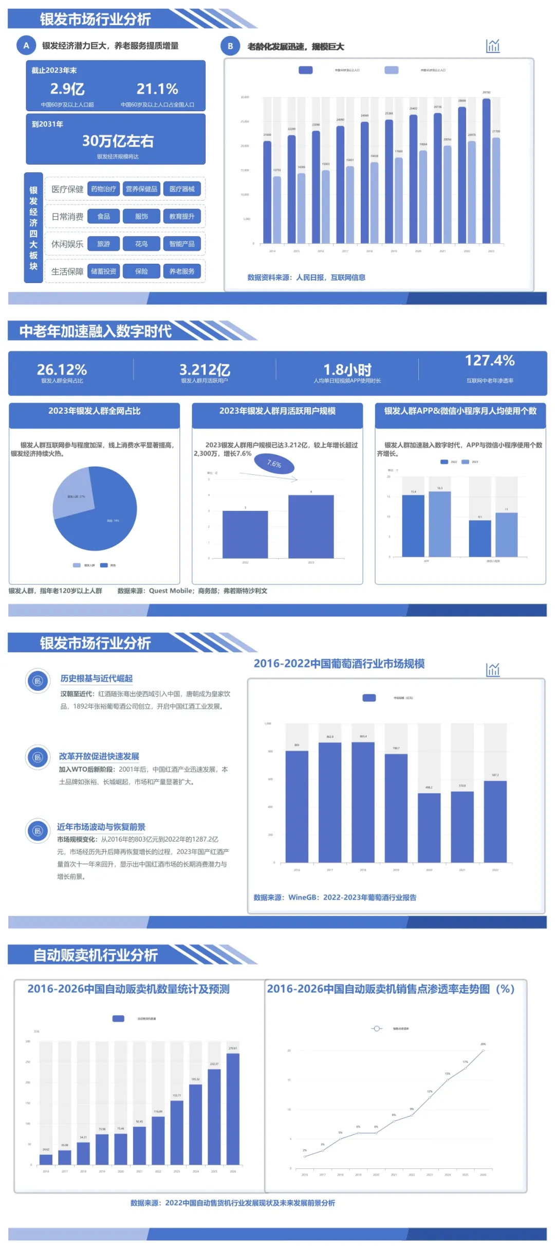 用简练的小标题打出“醒目招牌”,快速吸引注意力。例如“银发市场行业分析”这套PPT,每页用两到三个小标题提炼概括内容,呈现更清晰有序,直击观众眼球!
