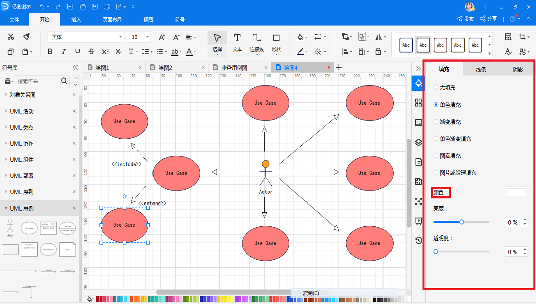 3、美化修饰:右侧有填充、线条、阴影功能,对绘制成型的用例图进一步美化,选中需要美化的符号,点选需要的美化项目即可。最后检查业务与用例图的搭配完整性后,一幅用例图就完成了。