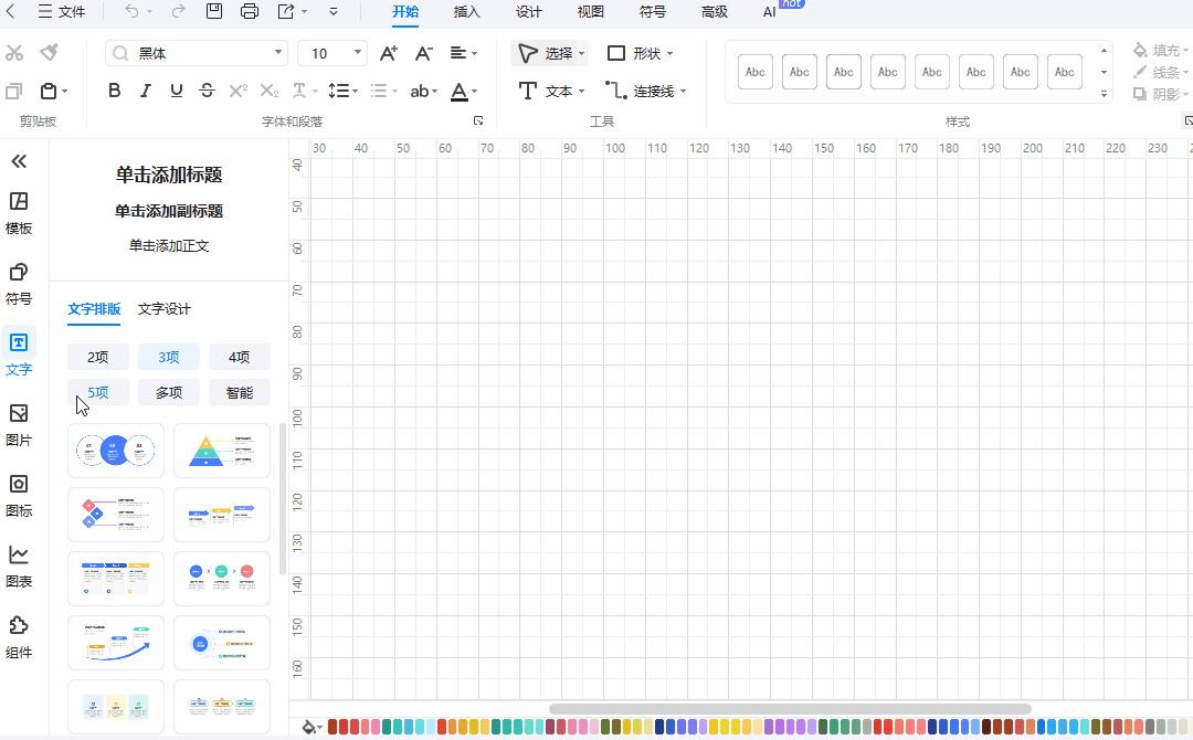 新版本对左侧绘图资源进行了全新归类划分,新增了作图时常用的素材类聚合在左侧绘图,现共有模板,符号库,文字,图片,图标,图表和组件七个资源分类,用户可以更便捷通过素材分类进行创作,再也不用来回切换找素材资源了,作图流程更顺畅!
