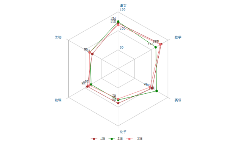 雷达图主要是用图形化方式展现对一个或多个客观主体的多个维度进行数值分析结果,目前在日常生活中有广泛延伸应用,如职业岗位的能力素质模型、各班各科成绩雷达图对比(图5)、企业运作效率指标对比等。