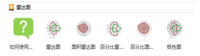 亿图图示提供了五种雷达图模板供选择,参考下图2所示,分别为:标准雷达图、面积雷达图、百分比雷达图、百分比面积雷达图、极性图。