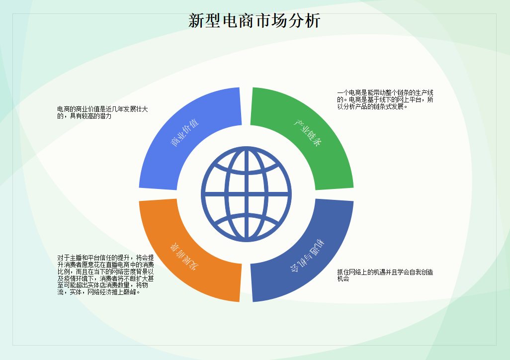 使用亿图图示绘制电商市场分析图,直接应用模板,再对模板进行加工和更替,最后导出为多种格式的文件即可,方便快捷。