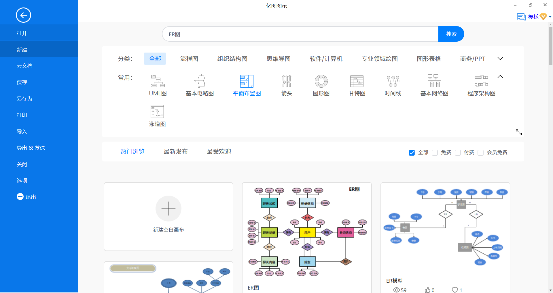 第一步:下载“亿图图示”电脑端软件安装并启动,或者直接访问亿图图示进入,在线制作,打开软件,就可以开始制作E-R图了!
