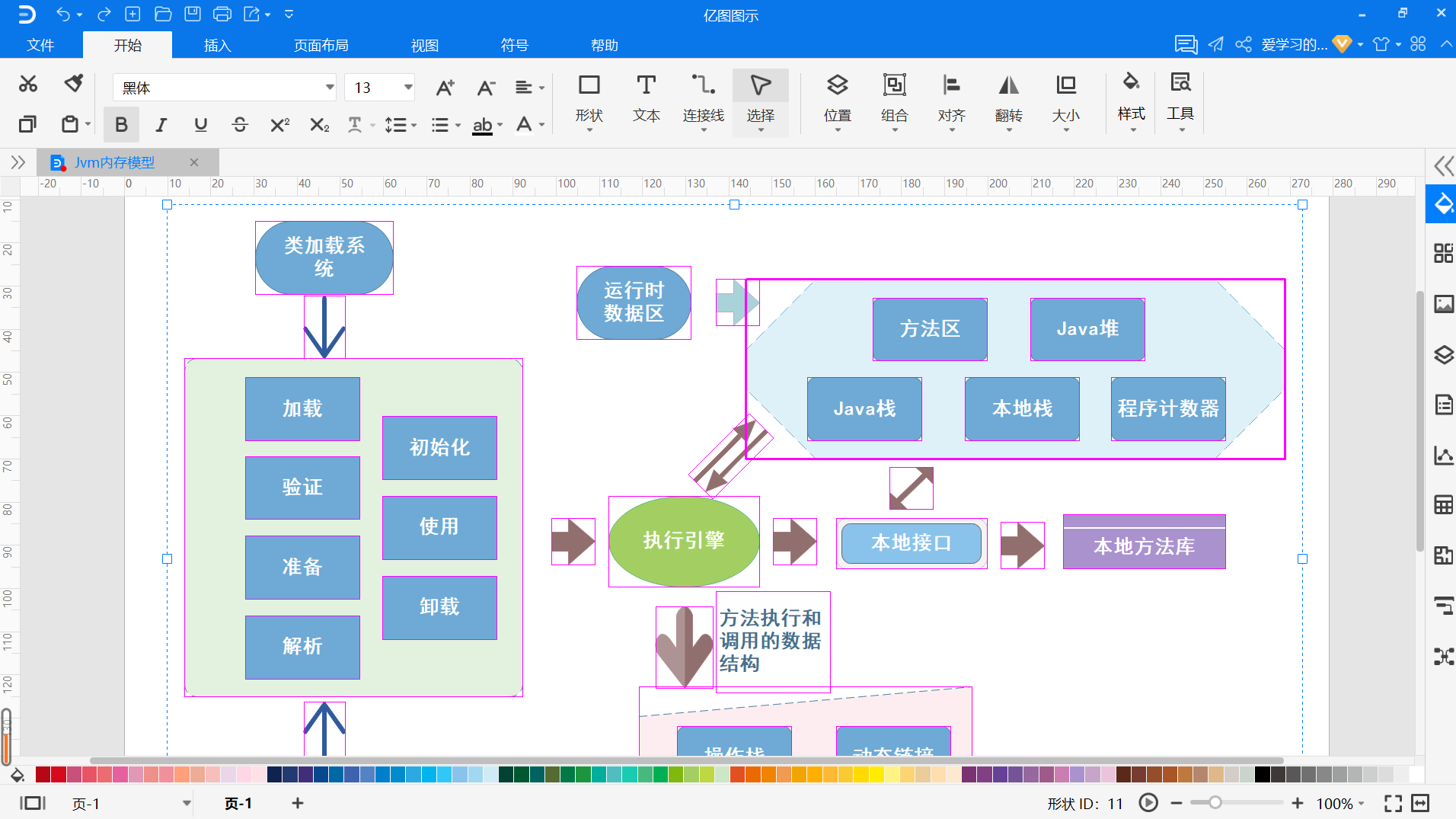 第三步:先点击画布中的jvm内存模型,点击需要修改的部分,可将左侧符号库中文本、边框和标题、图形符号等素材一键拖入画布中,进行修改图形与符号,操作非常方便。右侧面板可修改主题可配色,进行美化等操作。