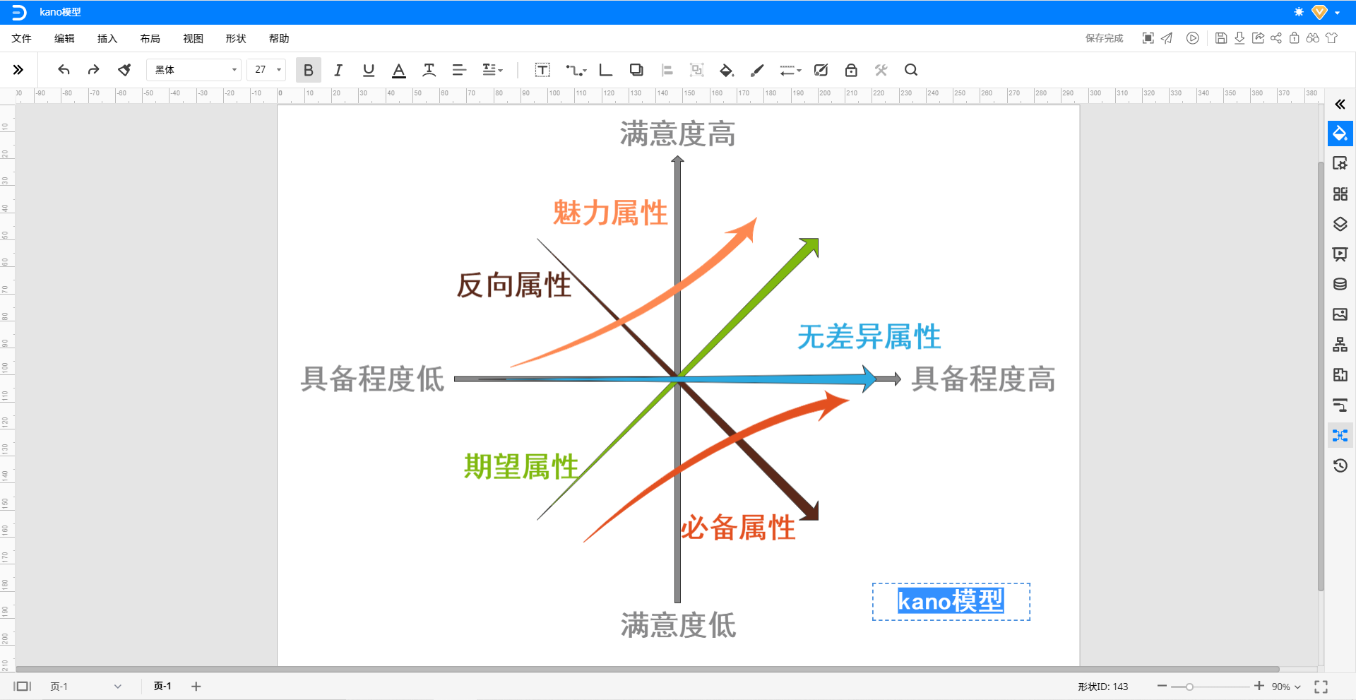 第五步:完成绘制后,可以对绘制好的kano模型作品进行保存、打印和分享等。还可以将作品导出为图片、PDF、PPT或其它格式。保存后,可以在我的文档内进行查看。采用云端保存,不论是网页版还是下载的亿图软件,都可以随时进行查看。
