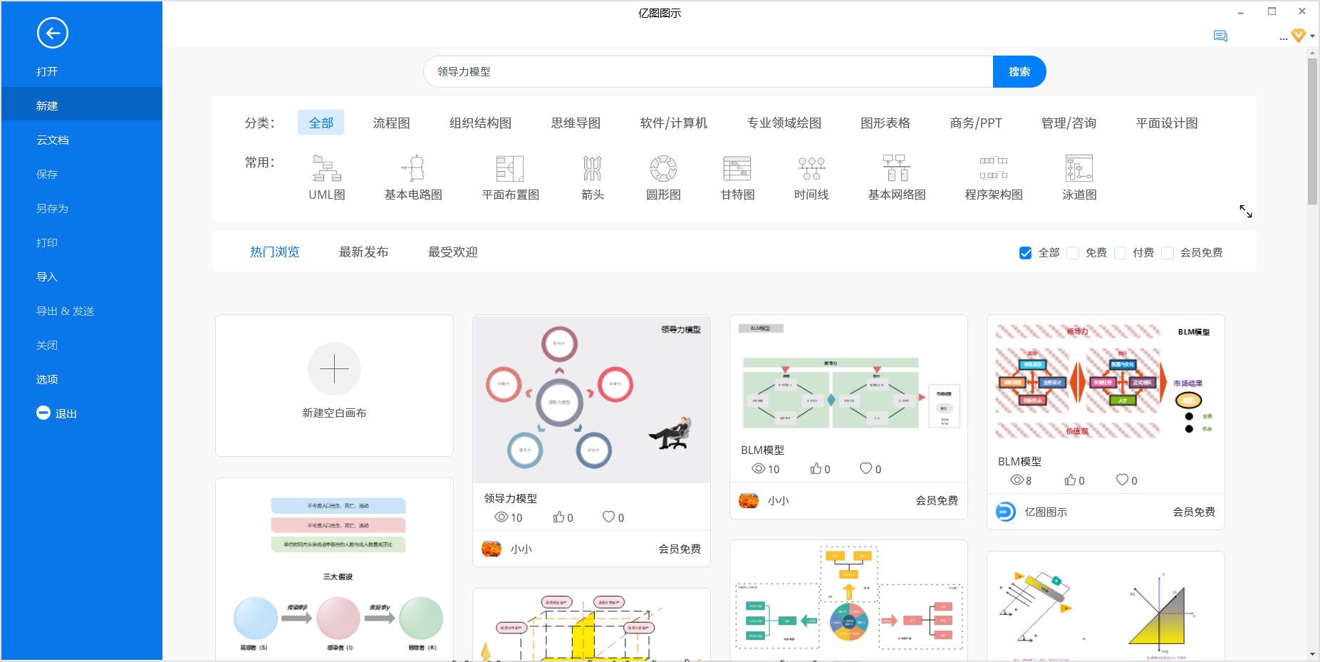 第二步:打开安装好的亿图图示,在界面上可以看到有新建这个选项,点击后在搜索栏里输入领导力模型,点击搜索,就可以找到我们要的领导力模型的模板,最后点击使用就可以套用该模板来绘制了。