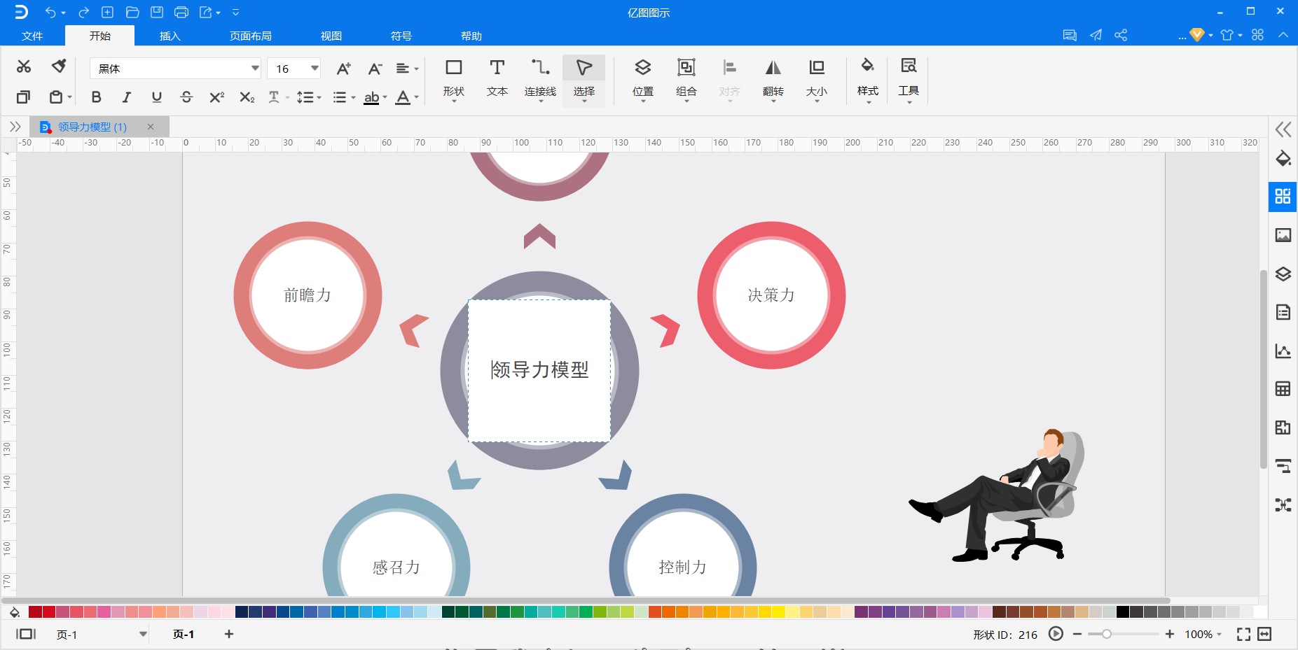 第三步:点击一下画布中的领导力模型,就可以看到界面的左侧处可以添加或修改维恩图形状,修改方法很简单,双击或拖动图形就可以完成操作。在界面右侧处则可以对模板的主题,颜色风格等进行修改,根据自身喜好来设计即可。
