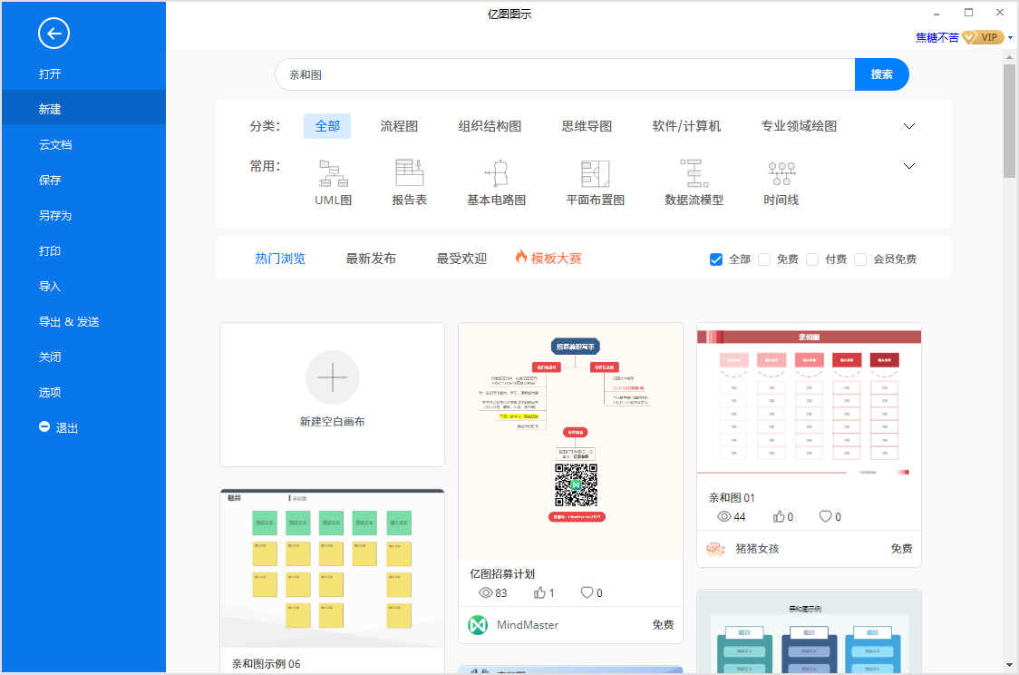 第二步:进入亿图图示后,新建亲和图。直接搜索“亲和图”,然后在下方的例子模板中选择一个模板,点击使用。