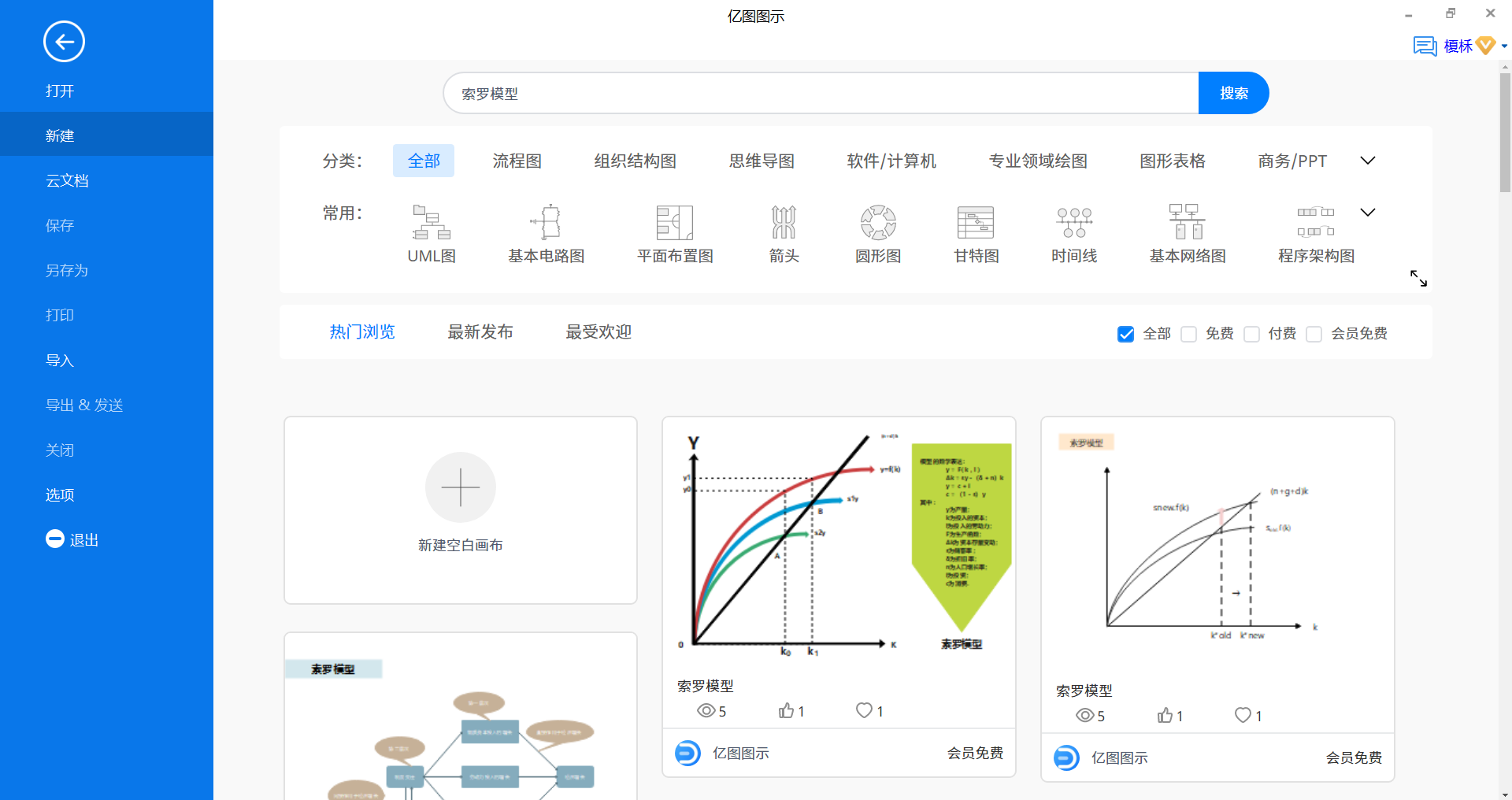 第二步:新建“索罗模型”。在软件的搜索栏中输入“索罗模型” 进行搜索。然后从搜索出来的海量模板中,选择其中一个模板,点击使用并打开已经选中的索罗模型模板。