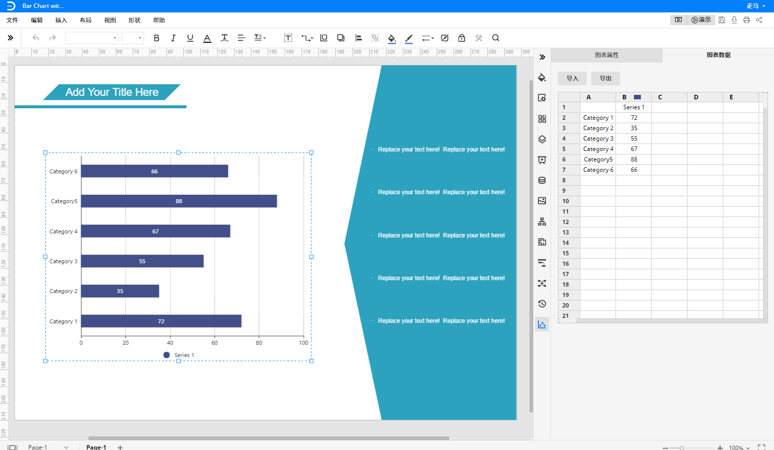 第三步:先点击画布中的条形图,再点击右侧属性面板中的数据符号,最后点击“图表数据”,通过修改表格中的数据,即可改变画布中条形图的数据。当然,也可以直接导入excel或csv数据文件,一键生成条形图。