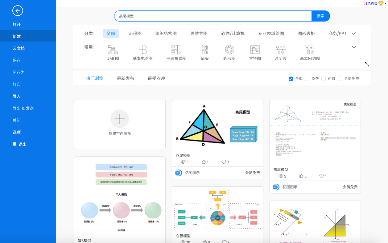 第二步:新建燕尾模型。在页面上方搜索框中输入“燕尾模型”,回车键确认,下方就会出现燕尾模型相关模板,选择一个打开即可开始绘制燕尾模型。