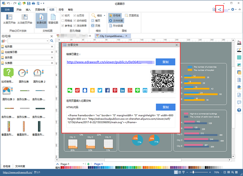 6、分享柱状图:绘图完成之后,可以直接保存原文件(eddx格式)以便后期进行修改,也可以导出为html、pdf、svg、透明的png格式、Word、Excel或者PPT格式等格式。在8.7以上版本中,还新增了一键分享功能,用手机扫描二维码,或者浏览器打开链接页面,就可以快速查看原文件,还可以再次分享到其他社交平台。