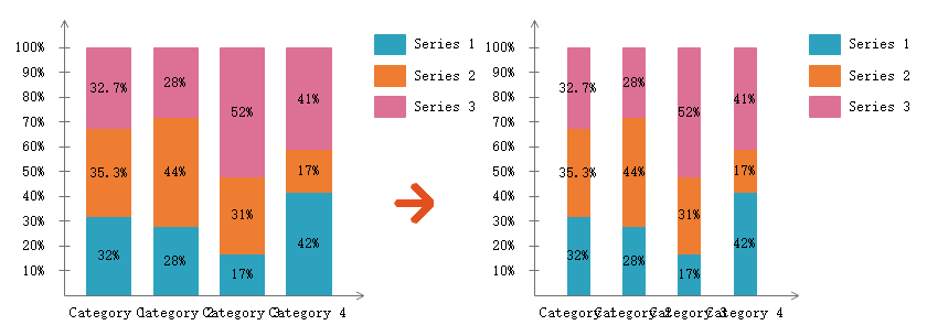 温馨提示: 对于百分比堆积柱形图,不能通过输入数值来编辑图形。先选中类别子形状,然后拖动黄色的控制点改变柱状的高度和数值。