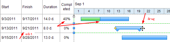 选择一个任务,拖拽进度条两端的控制点改变进度条的长度,然后开始时间、结束时间和持续时间等都会相应地自动改变。输入任务的完成百分比,然后绿色部分的进度条就会自动更新。