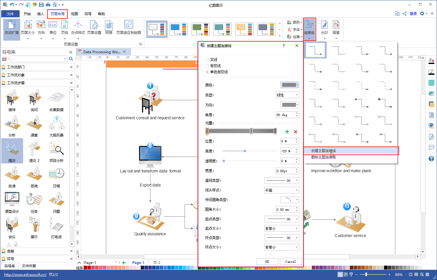 修改方法很简单,点击“页面布局”——“主题”——“连接线”,还可以自己DIY创建独特的主题连接线风格。