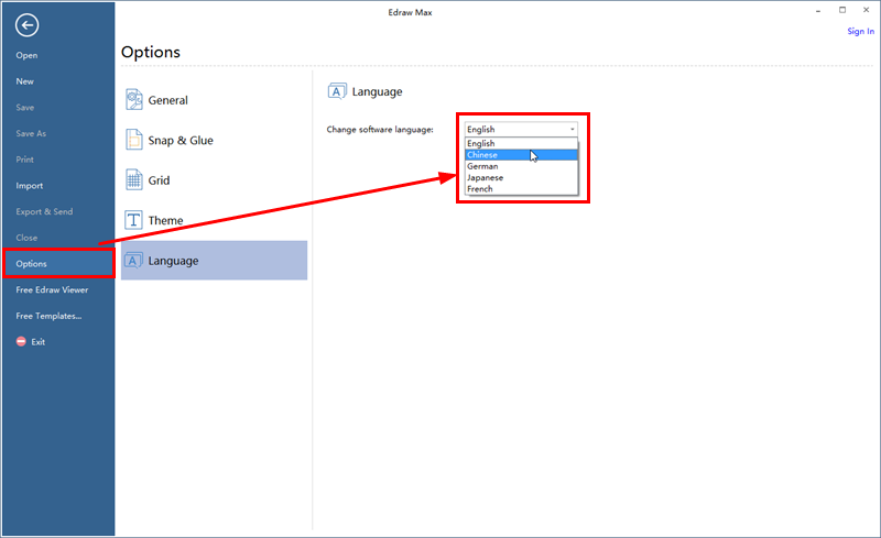 亿图图示软件V9.1版本,是多语言版本,增加了语言切换功能,可以在软件中直接将界面切换成简体中文、英语、日语、法语、德语这五种语言。详细操作方法如下所示: