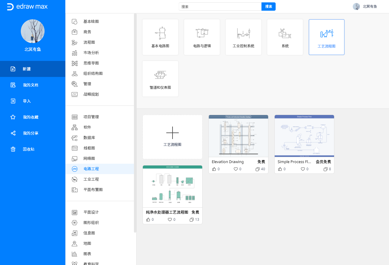 第二步:选择图表类型,找到“电路工程”,点击工艺流程图,选择模板并打开。