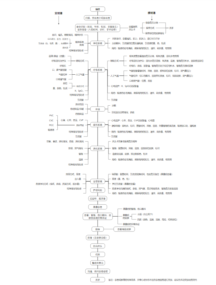 第五步:横向扩展具体工作内容。例如交班者的神经系统查体包括:意识、瞳孔、睡眠情况、精神状态、具体精神系统基本及特殊情况的紧急处理等,而接班者则需判断患者意识、肌力、肌紧张、具体用药等管理。