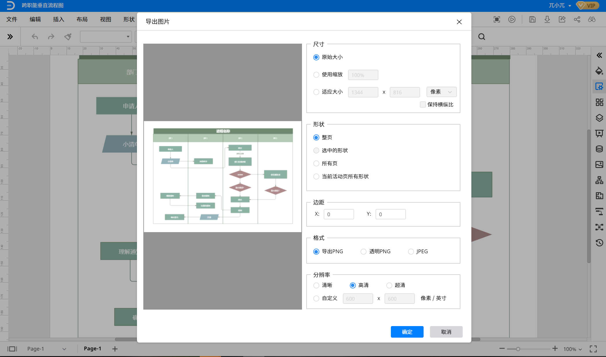 第五步:完成跨职能流程图的绘制后,可以点击右上角的保存、下载、打印、分享等按钮,对绘制好的跨职能流程图作品进行存储。也可以将作品导出为图片、PDF、PPT等格式。