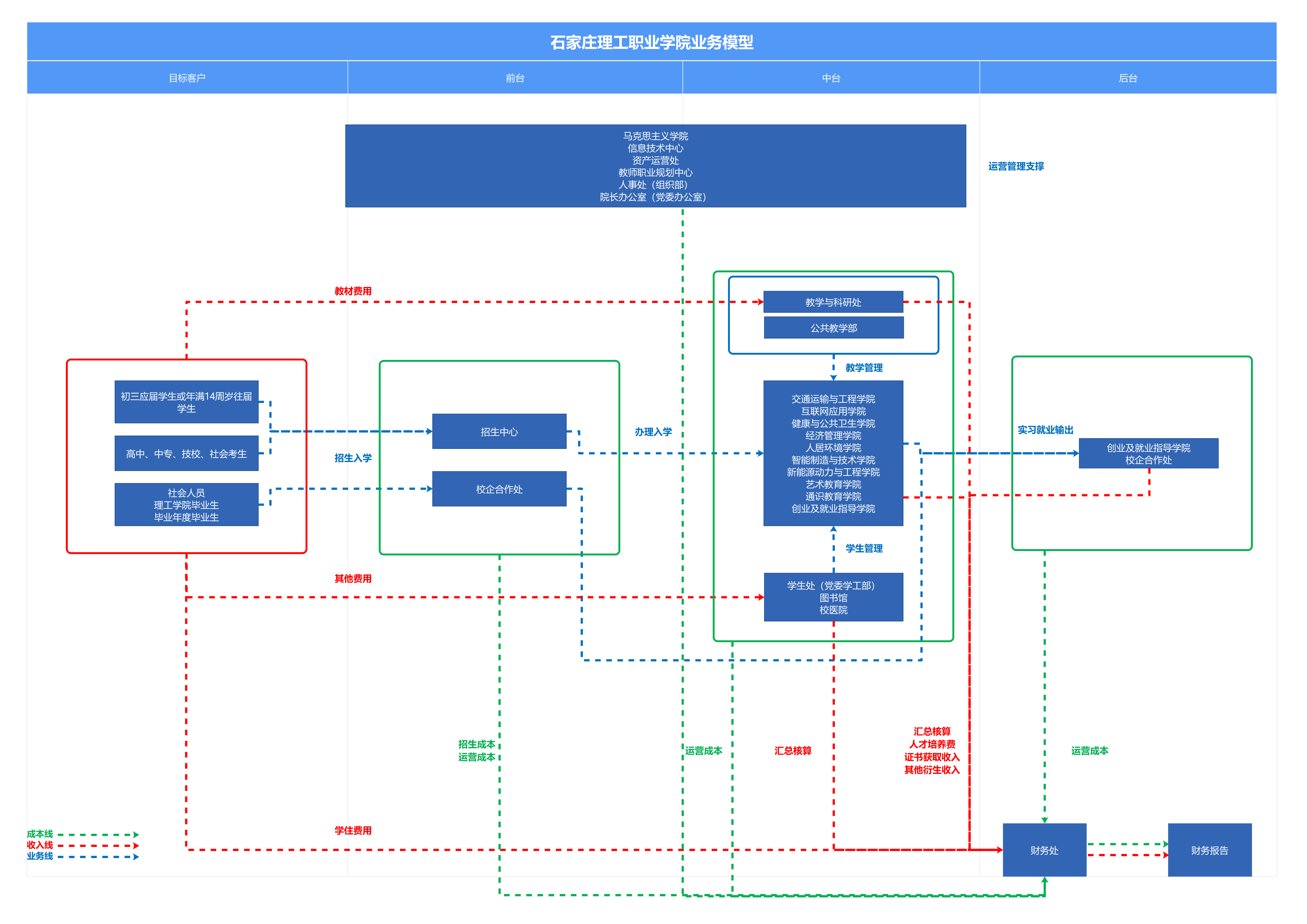 学校是如何运营的?学生所缴纳的学费是如何分配的?学生是如何成长管理的?理工学院业务流程图就将上述问题娓娓道来。首先学费是分为教材、住宿和其他着三个方面。招生中心负责学校的生源问题,学生进入学校之后,在具体的学院学习相关知识,日常生后受到学生处、教务处等的管理,充分掌握专业之后后便实习就业输出。一批又一批,周而复始,每个人都有属于自己的未来。