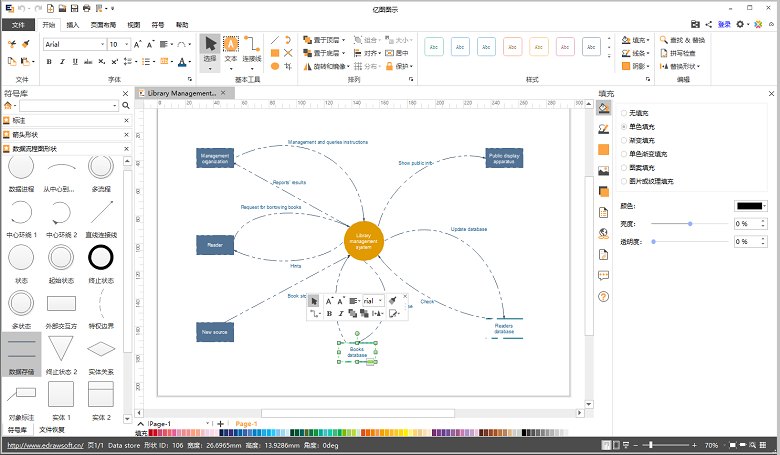 首先下载并安装亿图图示软件,找到流程图,选中模板页面的“数据流程图”并“双击”。跳转到新的画布,这时可以发现画布周边布满工具栏,左侧为符号库,可以直接拖拽里面的符号到画布,可更改大小和颜色。选取合适的中心方向符号来表示数据流向,方向符号可以通过旋转跟镜像进行转换。
