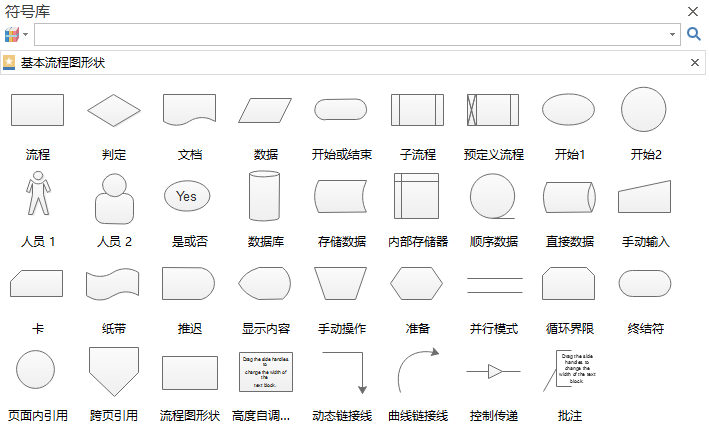 绘图界面的左侧是软件内置的符号库,里面有大量的图形、符号,双击就可以轻松调用,图形之间的连接、排版、布局都十分的智能化,无需复杂的操作,就可以轻松绘制出满意的流程图。