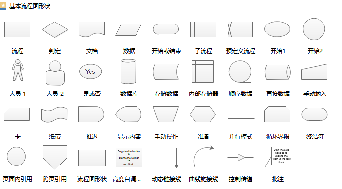 在软件中,双击打开模板后,就可以使用预设的标准流程图符号。这些符号都是符合行业标准,并被行业熟知认可的。所以大家设计时,尽量不要随意弄一个没有含义的符号。