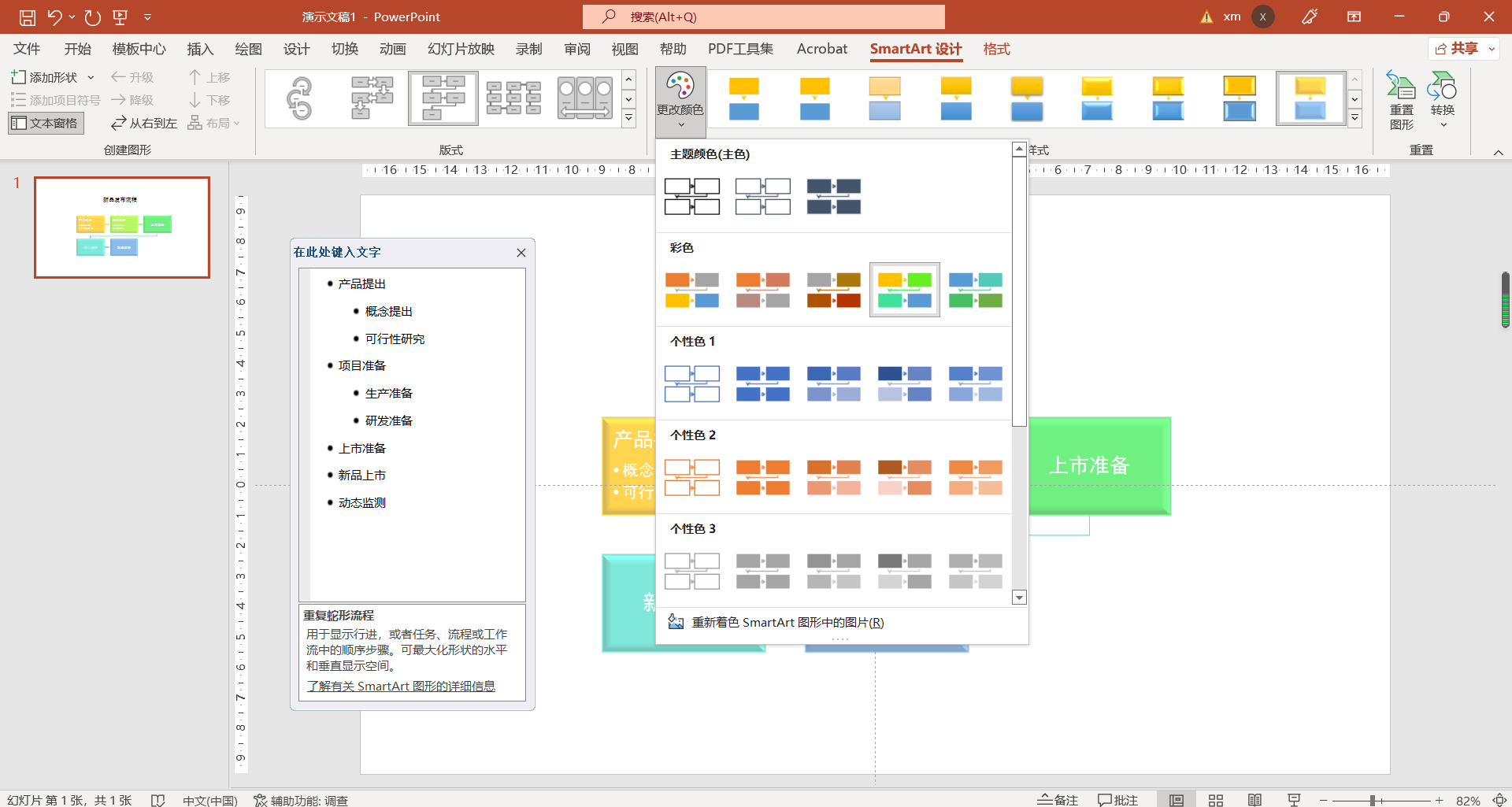 在“SmartArt设计”中,对流程图配色、效果进行修改。