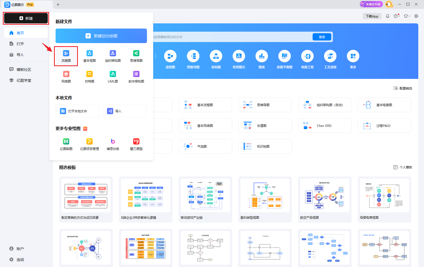 打开软件,选择“新建”-“流程图”,在右侧模板中选择基本流程图,可以新建空白画布,或是根据需求选择相关内置模板。