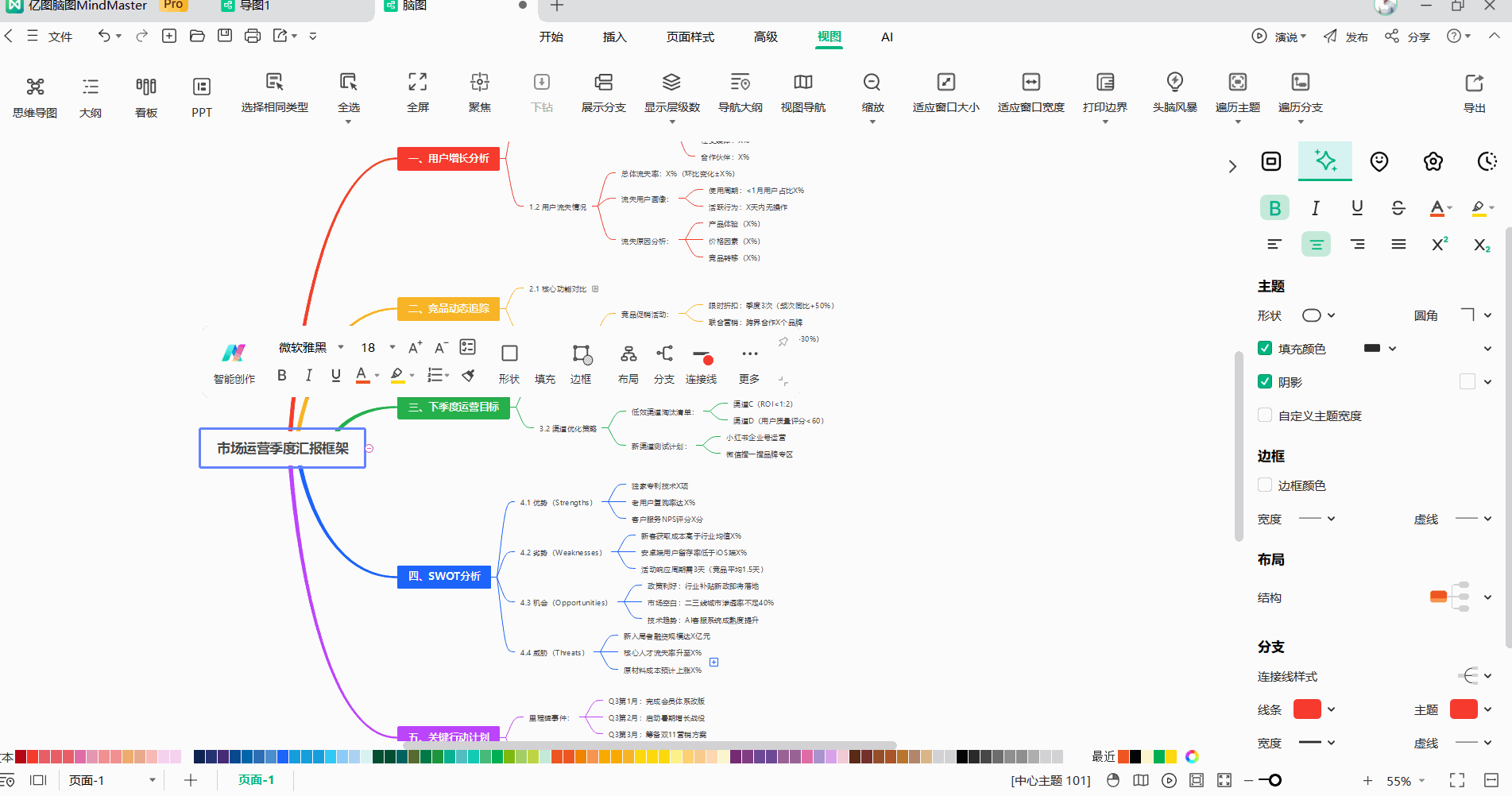 示例提示词:“生成市场运营季度汇报框架:需包含用户增长(新用户环比、流失率)、竞品动态(功能对比、营销策略)、下季度目标(预算分配、渠道优化);需要SWOT分析模块。请以 markdown 格式生成,方便我导入亿图脑图。”