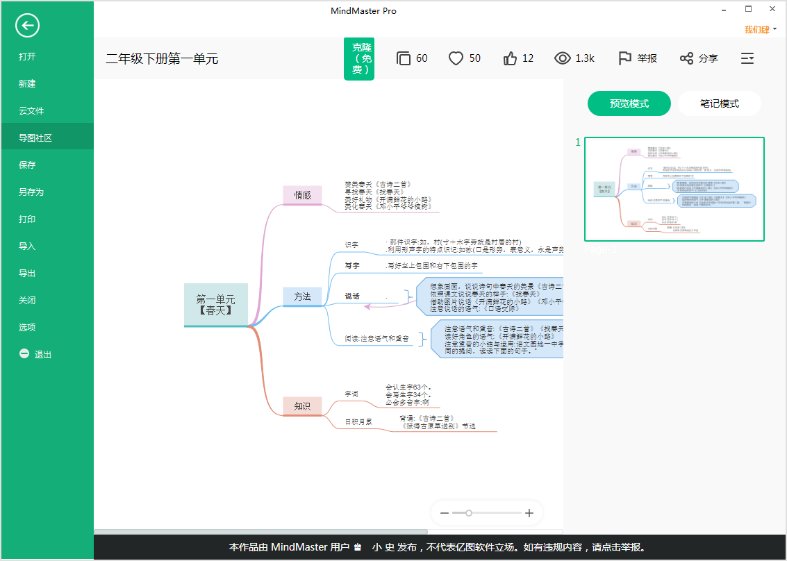 二是打开MindMaster里这一板块,搜索关键词“二年级下册语文”,就可以直接查找自己想要的内容,如果想要使用,就可以点击右上角的“克隆”按钮,就能保存并使用了,在此基础上还可以进行修改添加,甚至打印、导出图片等操作。