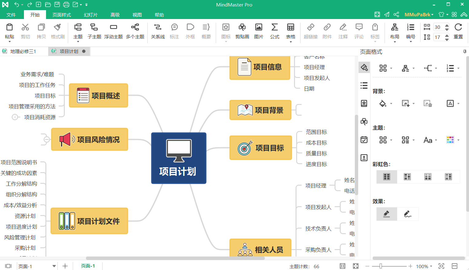 第一种:打开MindMaster软件后,新建画布,进行调整主题、颜色、字体,添加进自己喜欢的图标、需要的图形,编辑好文字后,思维导图就绘制完成啦。