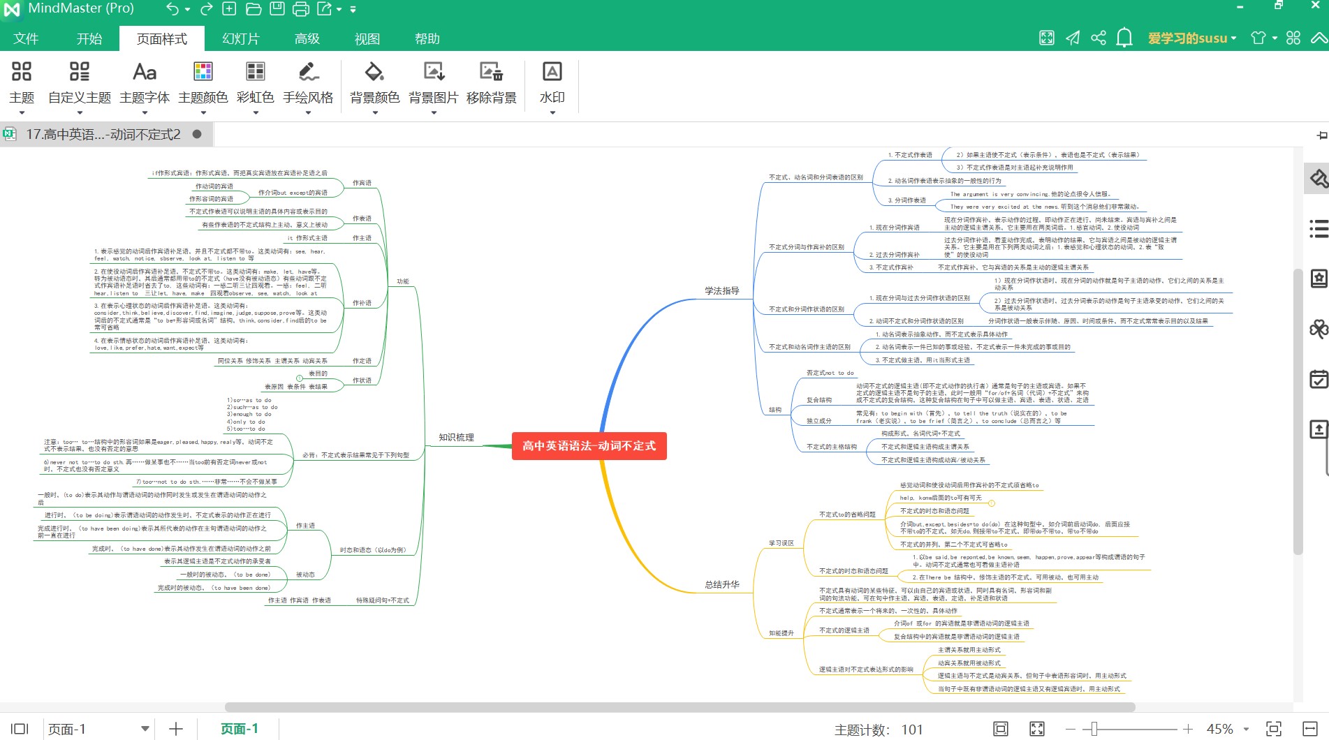 一种是使用亿图脑图MindMaster进行绘制,打开画布后,先输入关键词“高中英语:动词不定式”,再建立各级分支并依次在各个分支输入各版块内容,内容输入完成后,用户可根据自身喜好,一键修改主题、字体颜色、背景,一幅精美的思维导图就完成啦。