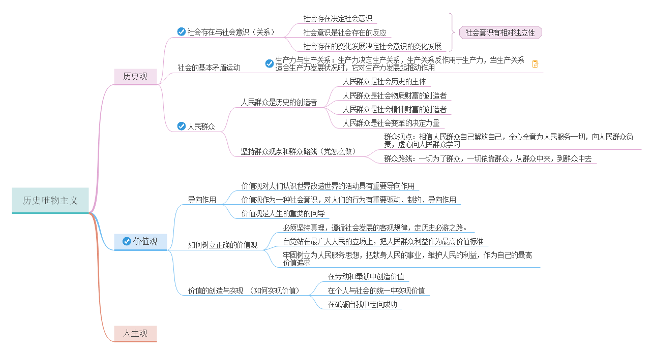 哲学是晦涩难以理解的,学生面对抽象的理论知识肯定会迷茫,不知从何下手学习,这时候就可以用思维导图来帮助学生更好的记忆这些系统化的知识点,绘制一幅思维导图能够以图像化的方法使学生快速抓取信息,提高学生的学习能力,对于细节内容学生再采用局部扫描式记忆,使之对知识内容掌握记忆的更加牢固。