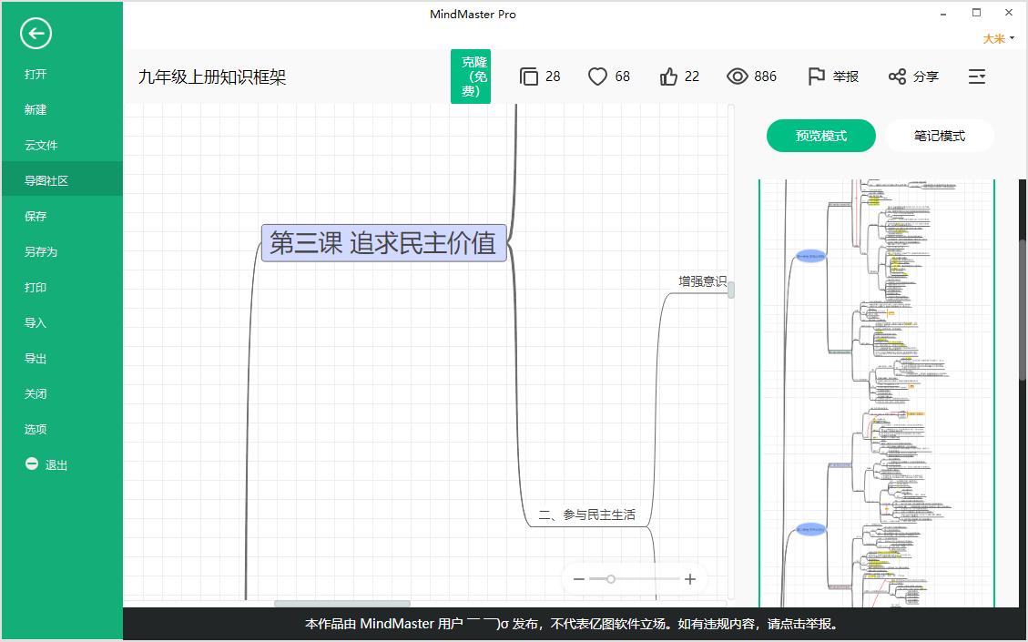 MindMaster不仅可以绘制九年级上册道德与法治,在导图社区中,多种类型的思维导图,例如、职业技能、读书笔记、电影盘点等类型,都可以找到。不仅如此,你还可以在思维导图社区发布自己绘制的思维导图,收取一定费用,赚取额外的收入!