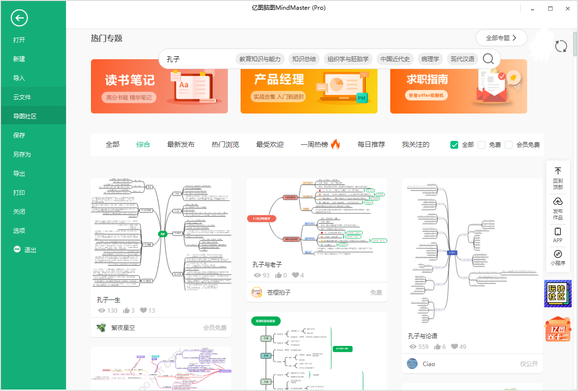 导图社区内不仅仅有孔子生平时间线思维导图,还有、六年级下册数学、中考英语等非常多思维导图供用户使用。MindMaster适合多种类人群,对于经常看书和记笔记的人群,可以用思维导图和其他笔记软件组合起来一起用,这样使读书写字更加便捷。