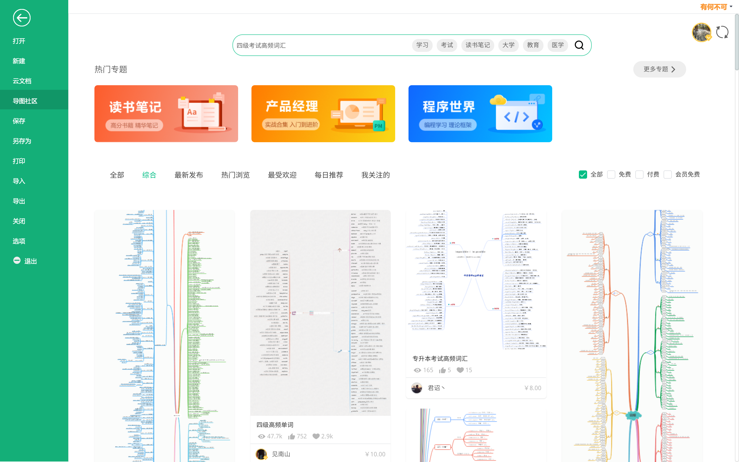 “导图社区”板块是思维导图的分享平台,使用MindMaster的小伙伴们可以在这里发布自己的原创导图作品,也可以在这里浏览、查看、点赞、收藏,使用其他人发布的导图内容。这里已经积累了超过10万张的思维导图成品。此外,这里不仅仅有英语考试相关的内容,还有其他涉及、编程、心理、产品不同类别的其他学习资料,相当于免费的电子图书馆,让考生在学习英语之余,还可以畅读其他各类思维导图,直接获取核心内容,大大节省看书的时间,岂能不进步神速。