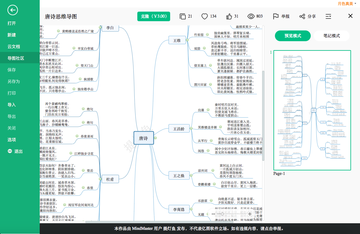 二,打开MindMaster后,选择,搜索框中输入关键词“小学语文唐诗”,回车键确认,下方既会出现与唐诗有关的思维导图。从中选择一款打开,点击上方的“克隆”按钮就可使用,对其进行修改、打印和导出图片等操作。