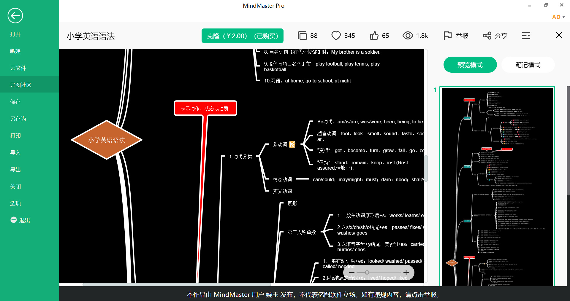 另外一种方法是,打开MindMaster里的功能,然后搜索关键词“小学英语语法精华版”,就可以找到并查看该内容,直接点击右上角的“克隆”按钮,就可以将已经选中的思维导图保存下来进行使用,还可以直接在线调整并打印等。