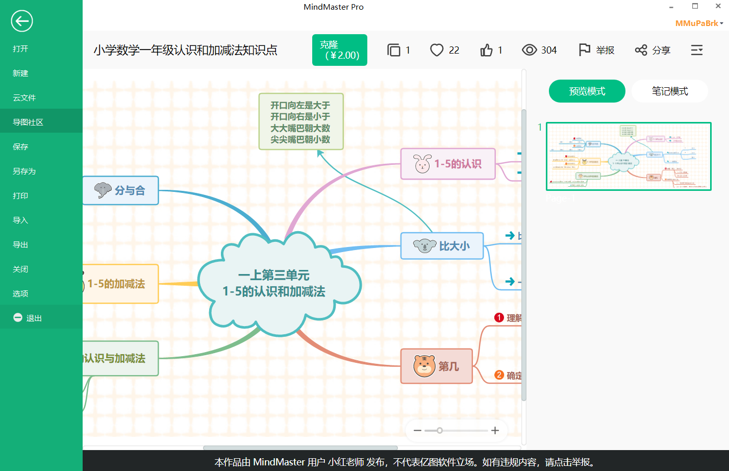 除了一年级下册数学思维导图以外,还有、五年级上册语文、四年级下册数学等各种思维导图给用户们提供选择,在思维导图社区中同时还拥有各种年级学习笔记和学习总结的思维导图。MindMaster思维导图社区是由不同用户构成的思维导图交流平台,在这里你不仅可以找到学习资料、学习总结,还可以自己绘制思维导图,然后发布到导图社区中,与用户一同借鉴学习。