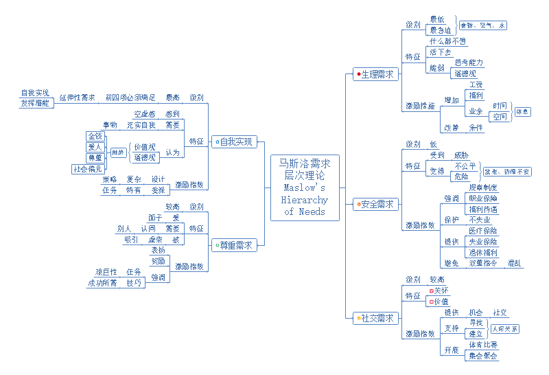 但这一满足不必是百分之一百的满足,只需要达到其个人在这一层次的某个临界点后就会激发对更高层次需求的追求,当然这一需求的满足也不会限制于当前层面上,会在发展更高层次的需求时,继续得到满足,只是不会作为个人需求满足的第一位而已。当然低层次需求的满足程度越高,对促进较高层次需求的发展,无疑是越好的,这就需要激励措施的实现了。那么我们接下来通过MindMaster思维导图了解一下马洛斯需求层次理论吧。
