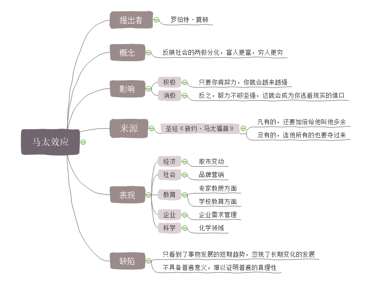 马太效应是指强者愈强、弱者愈弱的现象,广泛应用于社会心理学、教育、金融以及科学领域。马太效应,是社会学家和经济学家们常用的术语,反映的社会现象是两极分化,富的更富,穷的更穷。出自圣经《新约·马太福音》一则寓言:“凡有的,还要加倍给他叫他多余;没有的,连他所有的也要夺过来”。跟小编一起通过下面的MindMaster思维导图了解马太效应。