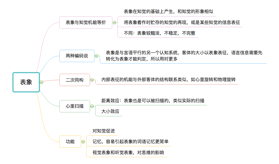 表象是指基于知觉在头脑内形成的感性形象,包括记忆表象和想象表象。表象与知觉技能是等价的,因为表象是在之举的基础上产生,但与知觉不同的是表象较暗淡,不稳定,不完整。以Kosslyn为代表的表象提出了心理扫描的概念,心理扫描模型认为对表象的加工就像对知觉材料的加工一样,在表征空间中大小不同,距离不同的表象具有知觉的特征,就像一个内部的心理之眼来扫描一样。而表象的功能主要是对知觉促进。使容易引起表象的词语记忆更简单,对思维也有一定的影响。
