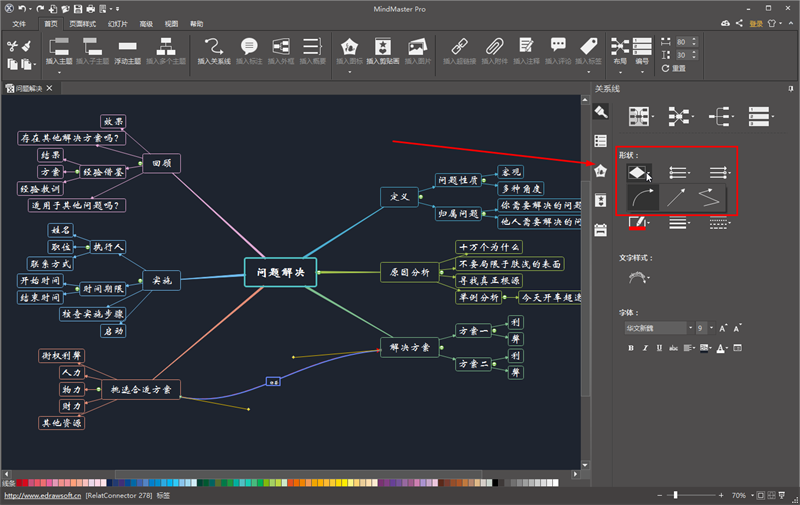温馨提示:关系线上有两个黄色的菱形点,拖动这些点,可以调整关系线的弯曲度和方向;选中关系线,再打开右侧工具栏,在“关系线”面板中,点击“形状”,可以将关系线设置为直线、折线、曲线,还可以对关系线的粗细,箭头样式进行调整。