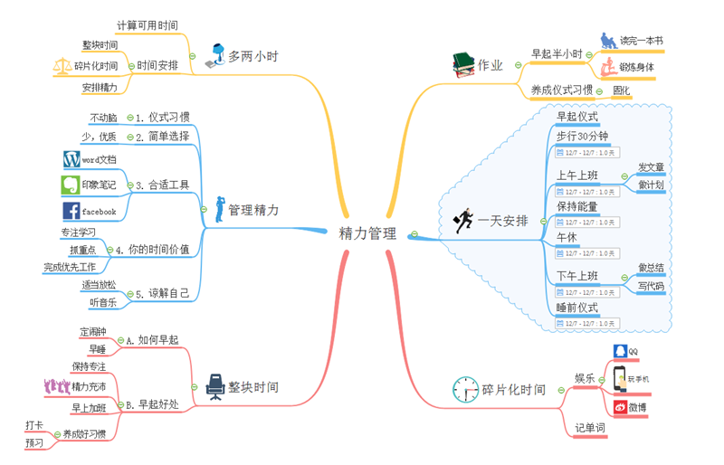 四、作好时间管理,提高注意力和时间管理息息相关。如果自制力不强的话,也可以通过一些专业的思维导图软件来帮助自己。通过思维导图制定时间规划,就不会出现很多事情甚至还没开始做,就已经走神了的状况。