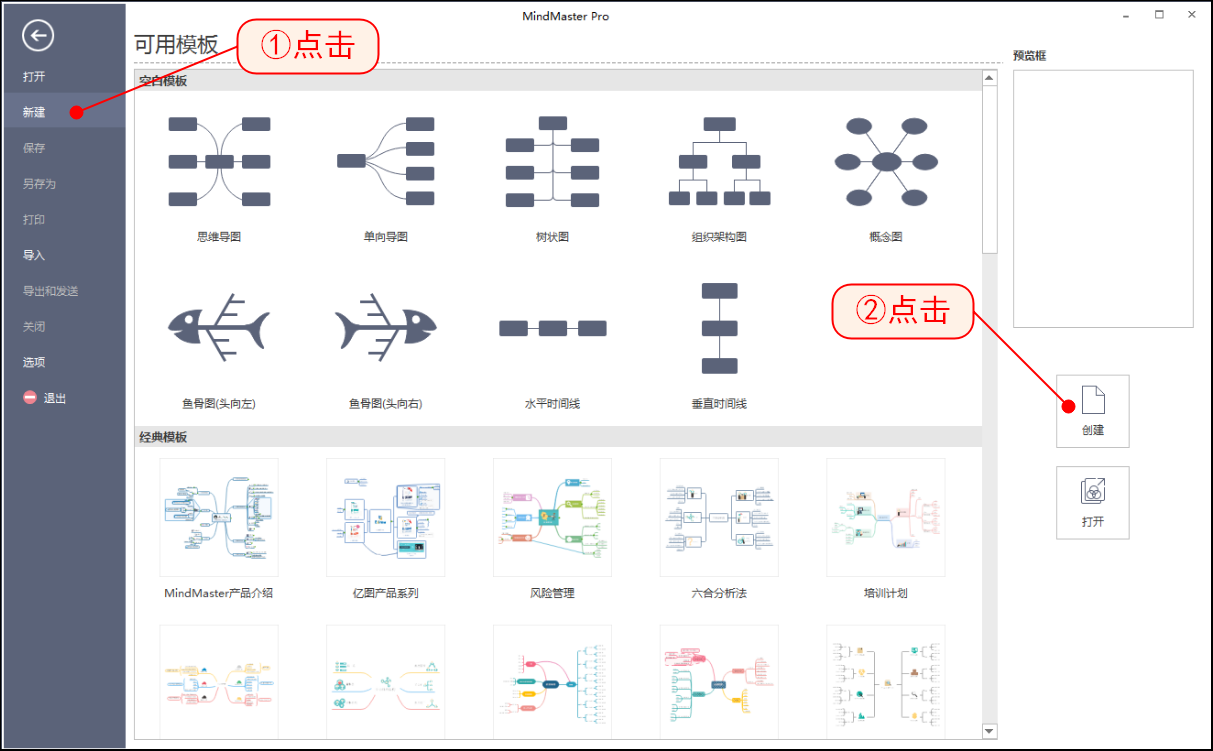 1、新建:双击运行MindMaster软件,按步骤依次点击,创建新的思维导图。