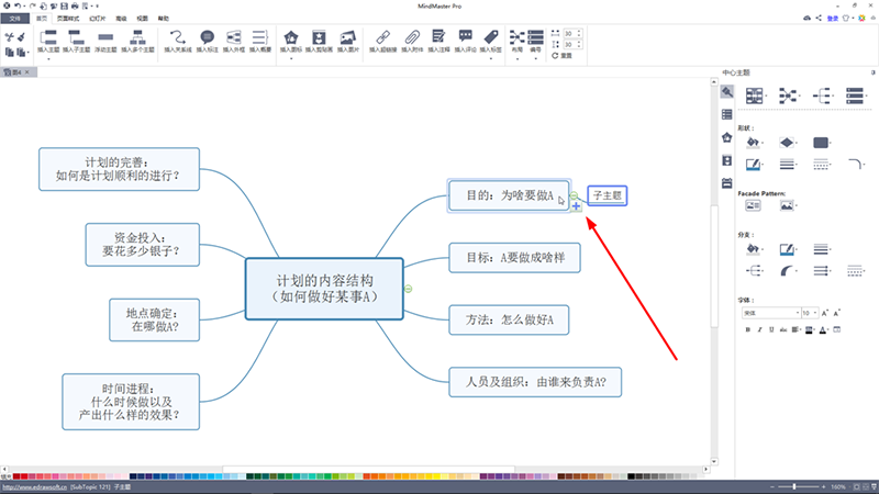 空白模板进去就直接有一个中心主题,双击输入文字,确定主题。将鼠标放在中心主题框上就会有一个加号,点击可以添加子主题,将脑子里所有的子主题都输入进去。